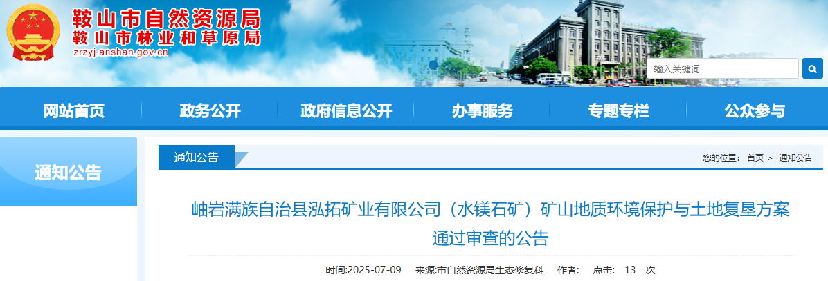 根据《国土资源部办公厅关于做好矿山地质环境保护与土地复垦方案编报有关工作的通知》(国土资规〔2016〕21号)和关于印发《矿山地质环境保护与土地复垦方案省级审查管理办法(试行)》的通知(辽自然资发〔2022〕129号)有关要求,岫岩满族自治县泓拓矿业有限公司(水镁石矿)矿山地质环境保护与土地复垦方案通过审查,现予公告。