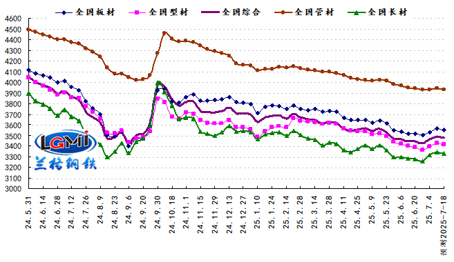 2025年第28周(2025.7.7-7.11)兰格钢铁全国绝对价格指数为3492元,较上周上升0.9%,较去年同期下降9.6%;其中,兰格钢铁长材绝对价格指数为3343元,较上周上升0.9%,较去年同期下降8.9%;兰格钢铁型材绝对价格指数为3428元,较上周上升1.1%,较去年同期下降10.9%;兰格钢铁板材绝对价格指数为3564元,较上周上升0.9%,较去年同期下降10.0%;兰格钢铁管材绝对价格指数为3945元,较上周上升0.4%,较去年同期下降9.8%。