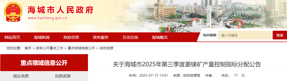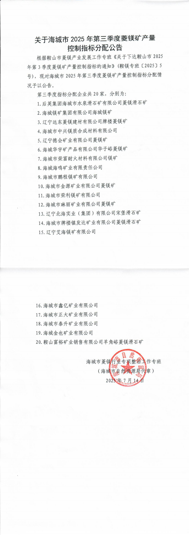 关于海城市2025年第三季度菱镁矿产量控制指标分配公告