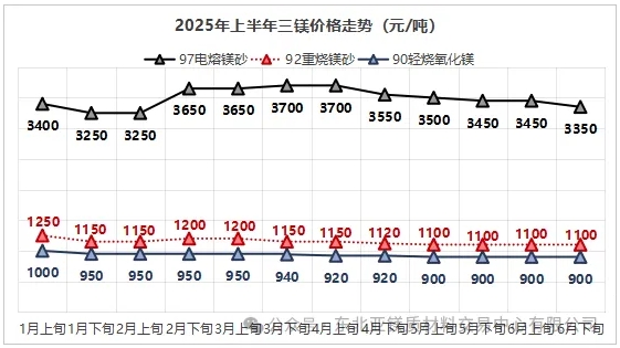 2025年1、2月份,下游钢铁、水泥等高温行业需求不佳,很多企业春节假期提前了近一个月,厂家报价基本稳定并未出现明显波动。但2月下旬起,电熔镁砂价格开始上涨,其原因是国内外石墨电极价格开始呈上涨趋势,同时传出辽宁地区3月初电费价格将迎来大调整的消息。2月底电熔镁砂生产企业纷纷调整价格,并表示电价正式调整后,产品价格会再次上调,期间很多龙头企业已停止报价。3月初辽宁地区电熔镁砂类产品报价再次大幅上涨,重烧镁砂企业也在尝试跟风调价,但因企业库存积压太多,下游行业需求又持续降低,重烧镁砂调价缺少支撑并未得到市场认可。而轻烧氧化镁也受出口和国内硫酸镁市场下行影响,价格呈下降趋势,其中90轻烧氧化镁因其用途主要是供脱硫使用,出货量相对较好。期间,97高纯镁砂降价后报价比95中档镁砂还便宜50元/吨,导致部分中档镁砂企业销售量锐减,库存积压严重不得已停产。5、6月份各类镁砂产品价格时有波动,但相对稳定。
