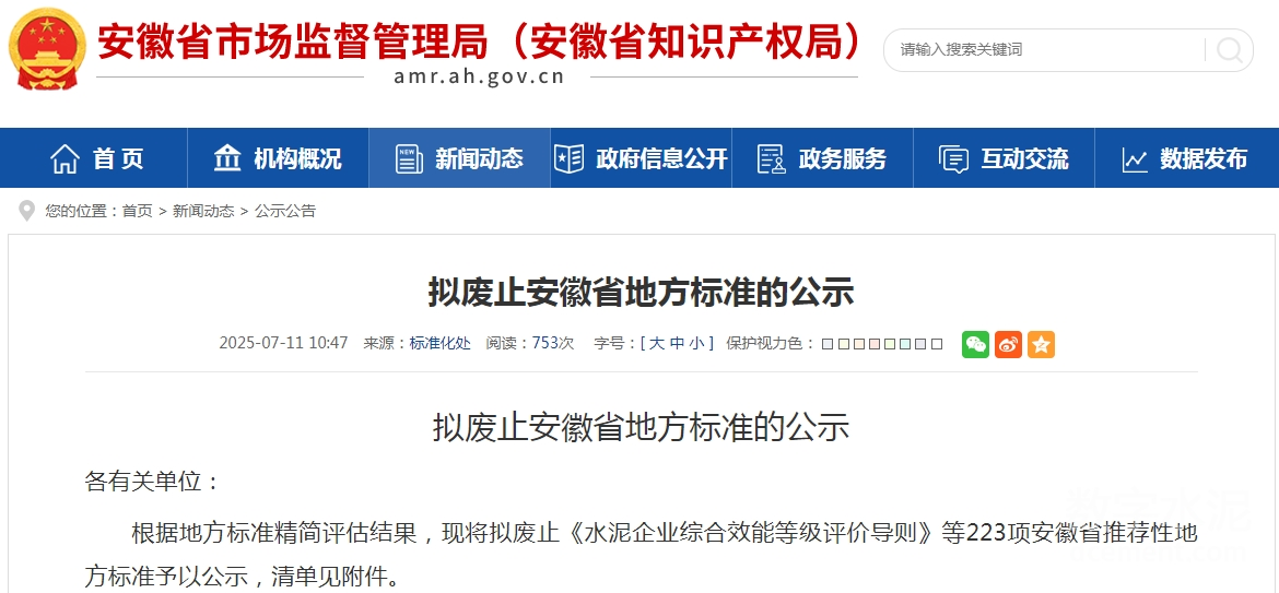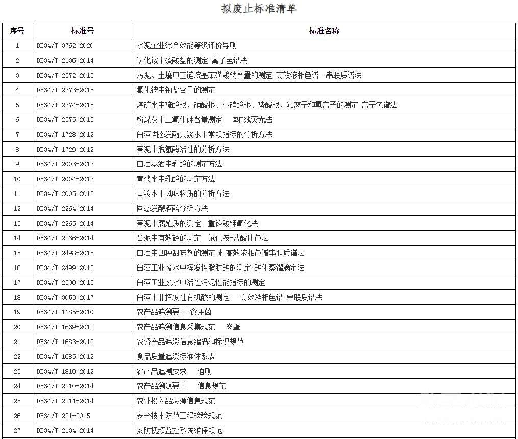 近日,安徽省市场监督管理局标准化处发布《拟废止安徽省地方标准的公示》称,根据地方标准精简评估结果,现将拟废止《水泥企业综合效能等级评价导则》等223项安徽省推荐性地方标准予以公示。