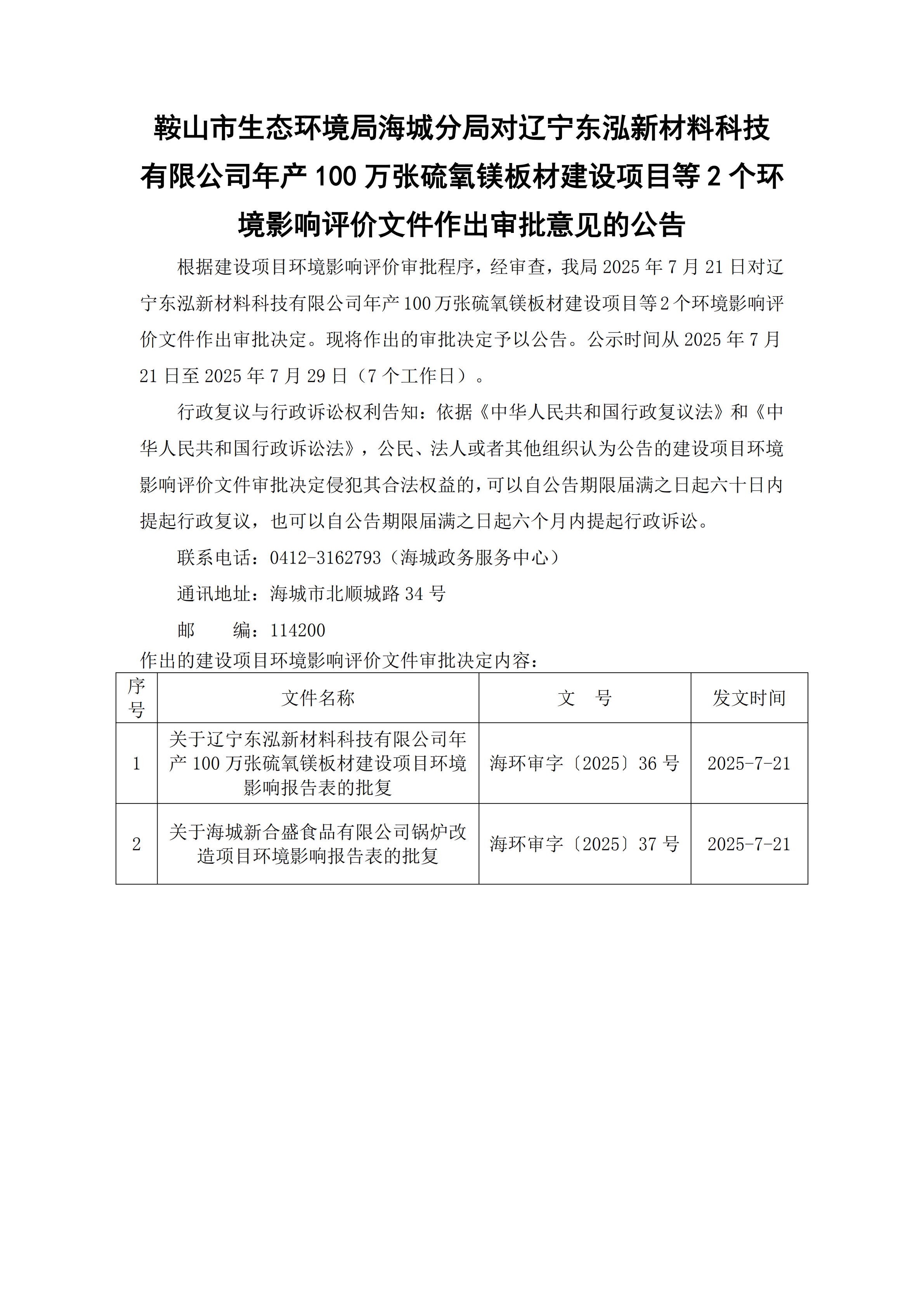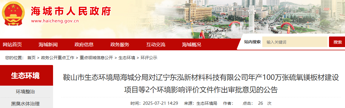 海城生态环境局对辽宁东泓新材料年产100万张硫氧镁板材建设项目等2个环境影响评价文件作出审批意见的公告