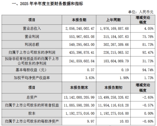 7月25日晚间,广东塔牌集团股份有限公司(下称“公司”)披露业绩快报显示:2025年上半年,公司营业收入205,624.80万元,较上年同期上升了4.05%;实现归属于上市公司股东的净利润43,539.69万元,较上年同期上升了92.47%。