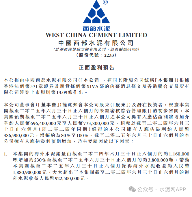7月23日,西部水泥发布公告,公司预计上半年归母净利润约6.96亿元至7.74亿元,去年同期约为3.87亿元,增幅约为80%至100%。