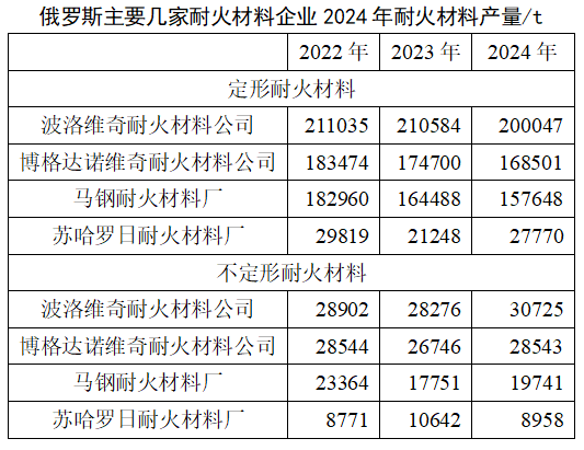 俄罗斯国内主要耐火材料生产企业有镁砂集团、博格达诺维奇耐火材料公司、第一乌拉尔硅砖厂(季努尔公司)、波洛维奇耐火材料公司、苏哈罗日耐火材料厂以及马格尼托戈尔斯克钢铁公司下属的耐火材料厂(马钢耐火材料厂)等。2024年部分企业的生产经营情况如下:
