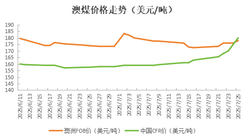 澳煤价格上涨的原因除了印度少量需求释放也有中国市场炼焦煤现货、期货的不断上涨的带动,整体看中国市场的好转尚未到达大幅采购海运煤的程度,但是部分参与者认为宏观经济预期的好转以及国家能源局发布的核查超产文件,会带动国内焦煤价格继续上涨,情绪较为高胀。终端钢厂尚能采购长协煤,对海运煤的需求有限,但是随着价差的缩小也有部分市场参与者对海运煤释放了采购兴趣。此外印度也释放了采购9月货物的需求,贸易商也在采购9月到达的货物,上周五有贸易商以178美元/吨的离岸价格,采购了7.5万吨低挥发优质澳煤,发货日期未定。他们预计印度会有需求,因此澳煤供应商报价小幅上涨。