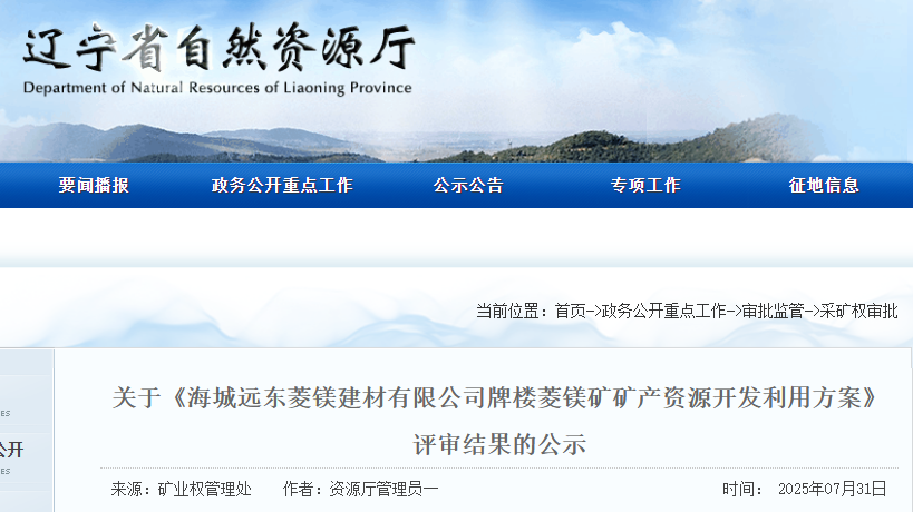 根据《自然资源部办公厅关于印发矿产资源(非油气)开发利用方案编制指南的通知》(自然资办发〔2024〕33号)、《关于印发 <辽宁省省级矿产资源勘查实施方案和开发利用方案评审工作规范(试行)> 的通知》(辽自然资办发 〔2024〕81号)等相关规定,辽宁省自然资源事务服务中心组织专家对《海城远东菱镁建材有限公司牌楼菱镁矿矿产资源开发利用方案》进行了审查,该方案已通过专家审查,现将审查结果予以公示。