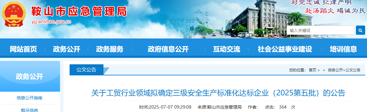 根据《应急管理部关于印发<企业安全生产标准化建设定级办法>的通知》(应急〔2021〕83号)《辽宁省应急管理厅关于印发<辽宁省工贸企业安全生产标准化实施办法>的通知》(辽应急规范〔2022〕3号)《鞍山市应急管理局关于印发<鞍山市应急管理局安全生产标准化建设工作办法>的通知》(鞍应急发〔2023〕51号)等文件规定,经企业自评、申请、评审、复审、公示等程序,确定鞍山市新迪炉业耐火材料有限公司、海城市后英兴东耐火材料有限公司、辽宁乾峰建筑工程有限公司、鞍山市和丰耐火材料有限公司、台安县欣鑫矿产品加工有限公司、鞍山热能滑动机械有限责任公司和辽宁俊龙耐火材料有限公司,共七家为工贸行业安全生产标准化三级企业,有效期自公告之日起3年。