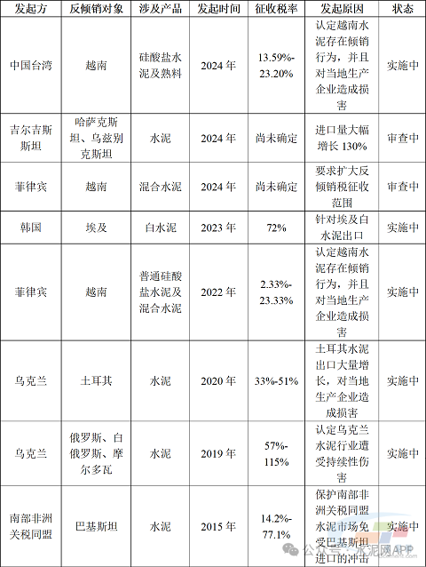 根据中国水泥网大数据研究院统计,2015年至2025年期间,全球范围内共发起了8宗反倾销案例,具体情况如下表: