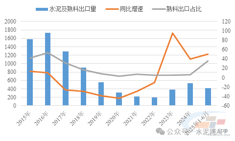 图1:2015-2025年上半年中国水泥及熟料出口情况(单位:万吨,%)