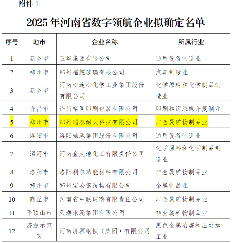 近日,河南省工业和信息化厅公示了2025年河南省数字领航企业、数字化转型“小灯塔”企业、服务型制造创新企业(平台)名单,郑州瑞泰耐火科技有限公司成功荣获“2025年河南省数字领航企业”称号。