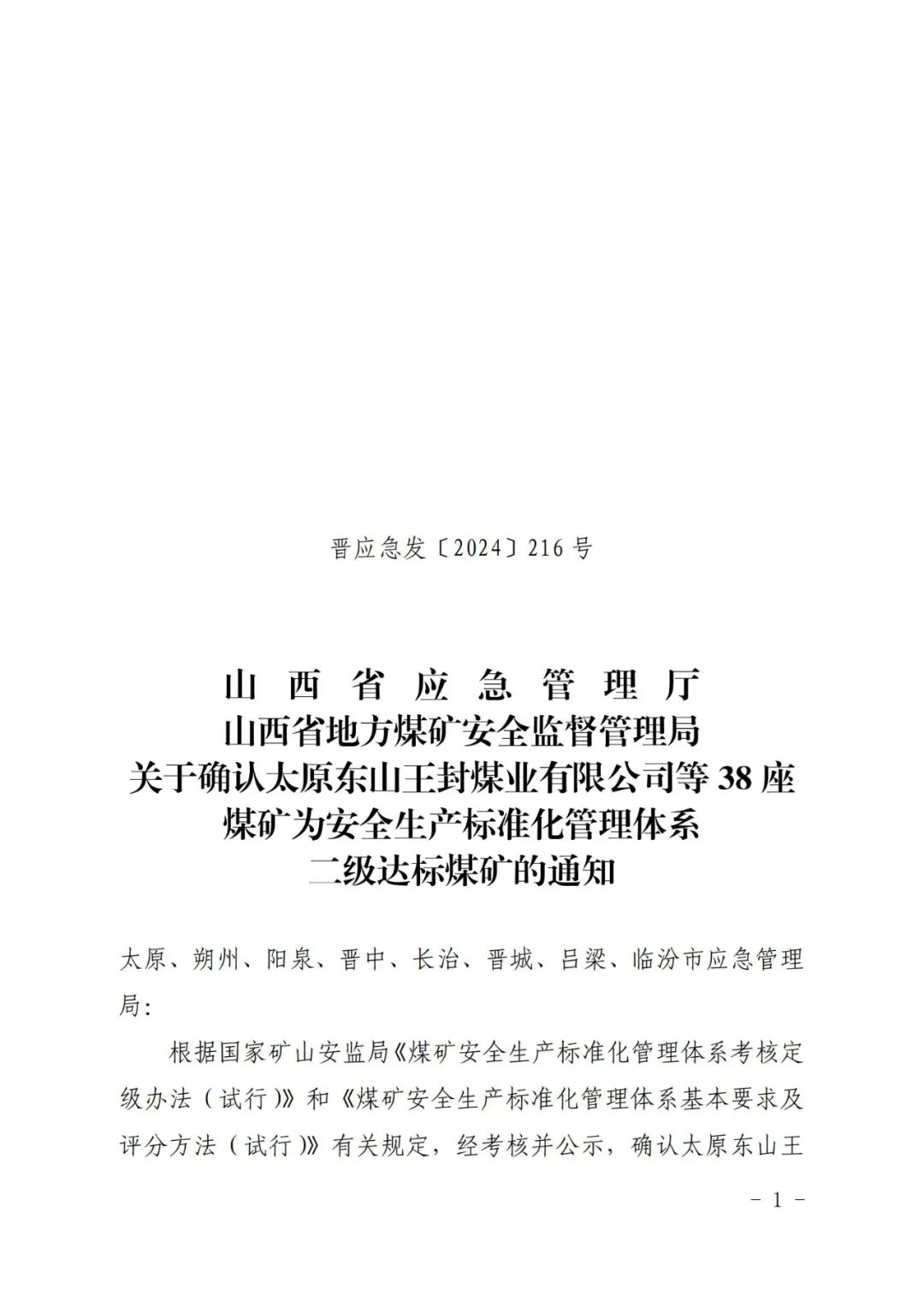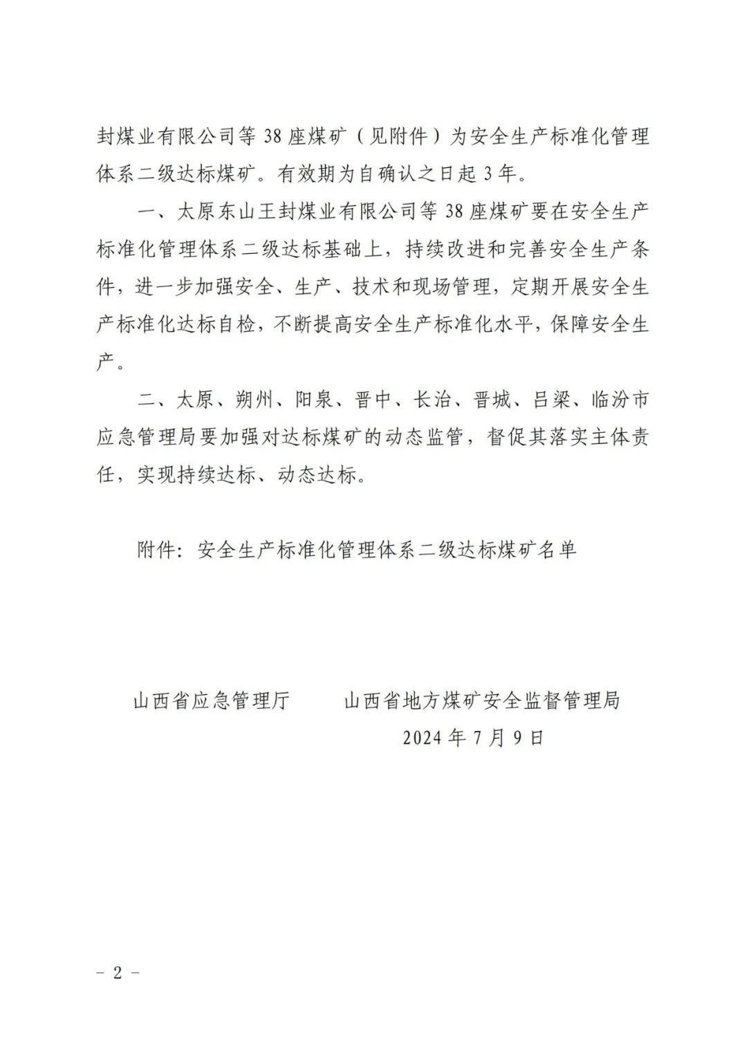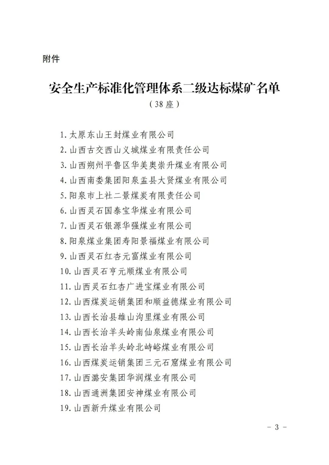 山西38座煤矿为安全生产标准化管理体系二级达标煤矿