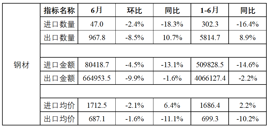 表1 2025年6月中国钢材进出口情况