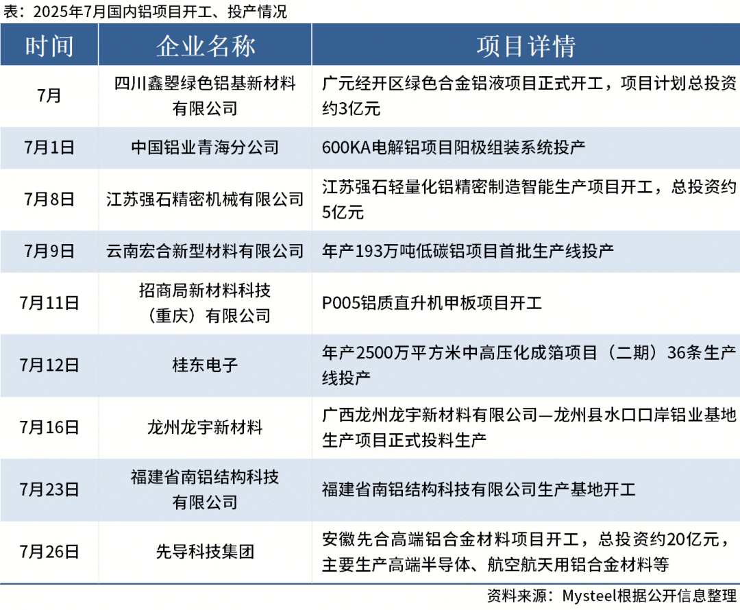 据不完全整理,2025年7月国内共9个铝项目开工、投产。