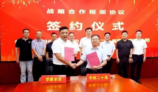 在杜平、李大江、张文峰、陈耀华的共同见证下,华新水泥中部区域重点项目总监窦军和中铁二十局物资设备部部长兼供应链管理中心主任张学春代表双方企业签订战略合作协议。