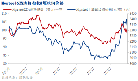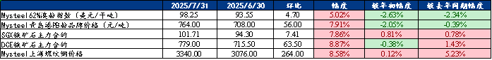 截至7月31日,Mysteel62%澳粉远期价格指数98.25美元/吨,环比上涨4.7美元/吨,涨幅5.02%。上海螺纹钢价格3340元/吨,环比上涨264元/吨,涨幅8.58%。