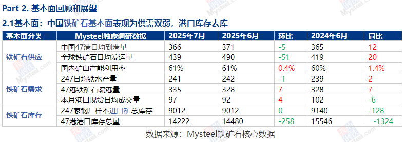 本月铁矿石基本面点评:7月中国铁矿石基本面表现为供应降幅大于需求的局面。供应端方面,因全球澳洲发运季节性回落,叠加部分海漂库存仍未兑现至到港,7月47港日均到港量环比减少。