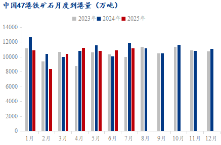 铁矿石到港量:7月份47港到港总量环比增加,处于近三年同期中位水平。目前7月日均到港量为366.1万吨,环比减少5万吨,同比增加12万吨。