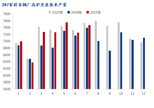 需求端方面,7月整体铁矿需求背景与6月相近,钢铁出口在90天关税暂停期内继续维持较高水平,成材产量及需求双降,厂库压力累积有限,全国钢厂盈利率连续攀升至65%的较高水平,难有实际减产压力,月内铁水产量下滑至239.8万吨后回升至242万吨。