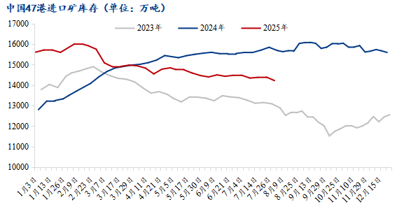 7月中国47港铁矿石库存体呈现去库趋势,截至7月31日,47港铁矿石库存总量14222万吨,较上月底去库264万吨,比今年年初去库1388万吨,比去年同期库存低1324万吨。