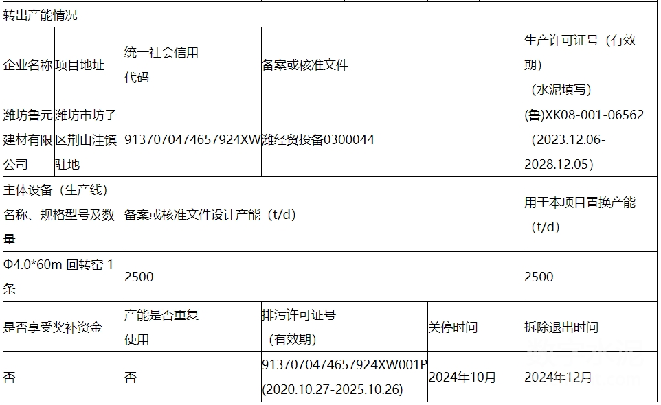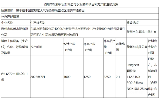 根据公示,东郭水泥有限公司4000t/d新型干法水泥熟料生产线暨900t/d协同处置生活污泥和生活垃圾环保示范技改项目补充产能1250t/d,补充后产能5250t/d,置换比例为2:1。转出产能来自潍坊鲁元建材有限公司2500t/d水泥熟料生产线,已于2024年12月拆除退出。