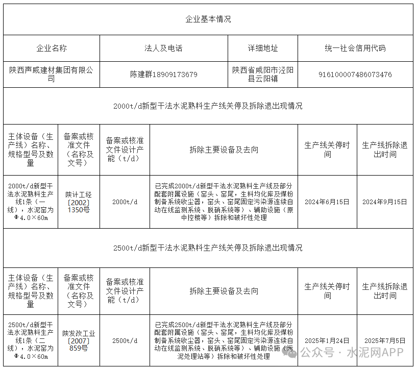 8月4日,陕西咸阳市工信局发布“关于陕西声威建材集团有限公司2000t/d、2500t/d水泥熟料生产线关停及拆除退出的公示”。