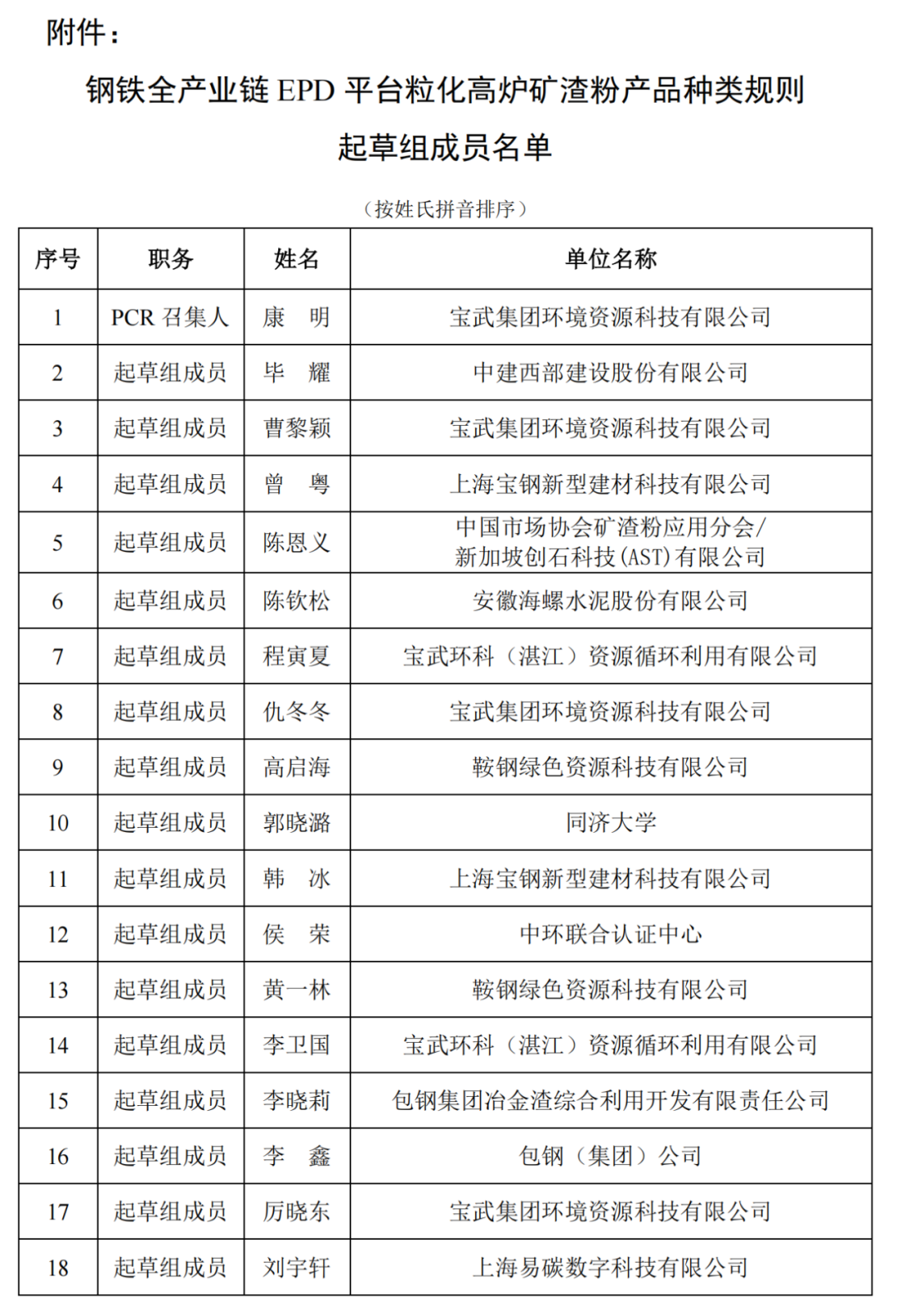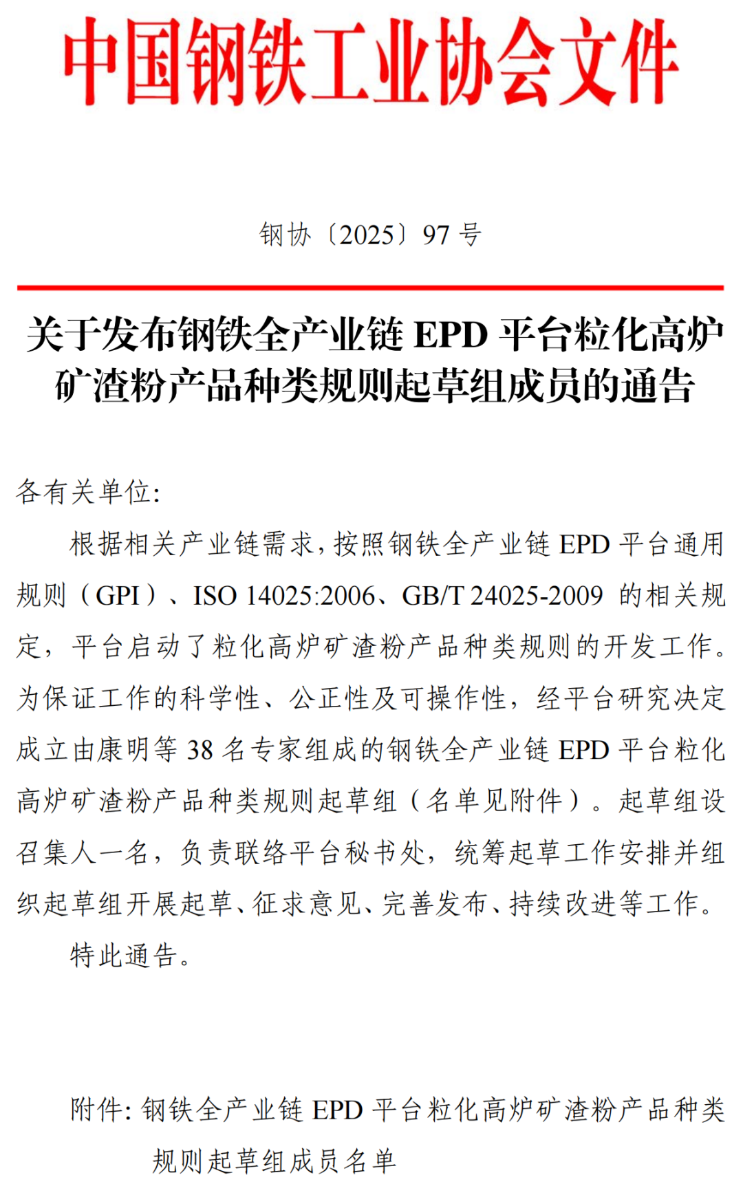 关于发布钢铁全产业链EPD平台粒化高炉矿渣粉产品种类规则起草组成员的通告