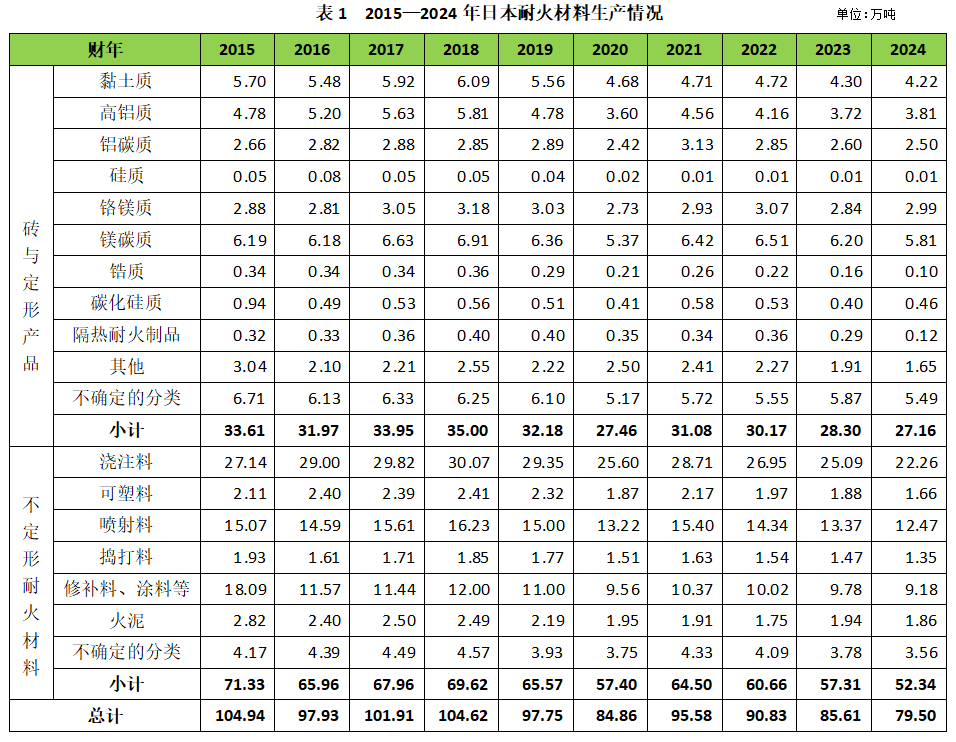 据日本耐火材料技术协会统计数据,2024年日本全年耐火材料产量79.50万吨,比2023年的85.61万吨下降了大约7.1%;其中,定形耐火产品为27.16万吨,同比下降了约4.0%(上年约为28.30万吨);不定形耐火材料产量大约为52.34万吨,同比下降约8.7%(上年同期为57.31万吨)。