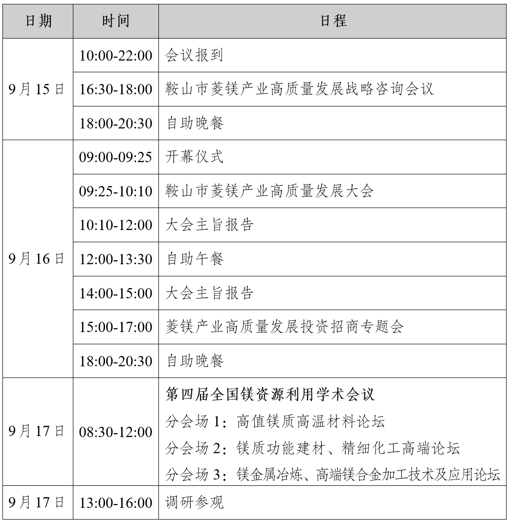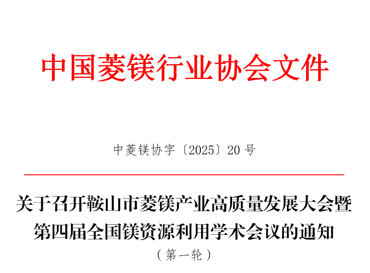 鞍山市菱镁资源禀赋突出,保有储量4.26亿吨、占全国61.29%的菱镁资源,素有“世界镁都”的美誉。当下,正值鞍山市菱镁产业转型升级、迈向高质量发展的关键节点,为提升鞍山市菱镁产业科技创新能力,全力提升产业链高端化、绿色化、智能化发展,推进产业链、创新链、人才链深度融合,健全鞍山市菱镁产业技术、人才和产业体系,将于2025年9月15日-17日在辽宁省海城市举办“鞍山市菱镁产业高质量发展大会暨第四届全国镁资源利用学术会议”,旨在加强菱镁产业科研成果交流及推广应用,推动鞍山市菱镁产业高质量发展,助力鞍山市打造世界级菱镁产业创新集群,擦亮“世界镁都”城市名片。现将相关事宜通知如下。