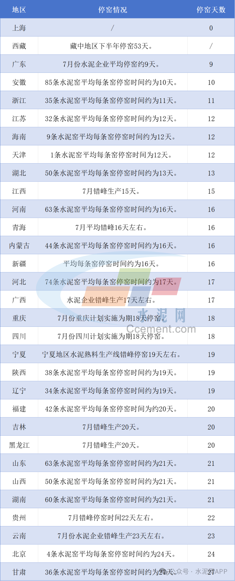 据市场反馈,8月20日起京津冀全域熟料线将停窑15-20天,部分区域15日起停窑;东北三省8月继续停窑20天;河南省水泥企业8月15号起停窑20天;云南区域三季度计划执行累计50天错峰生产...