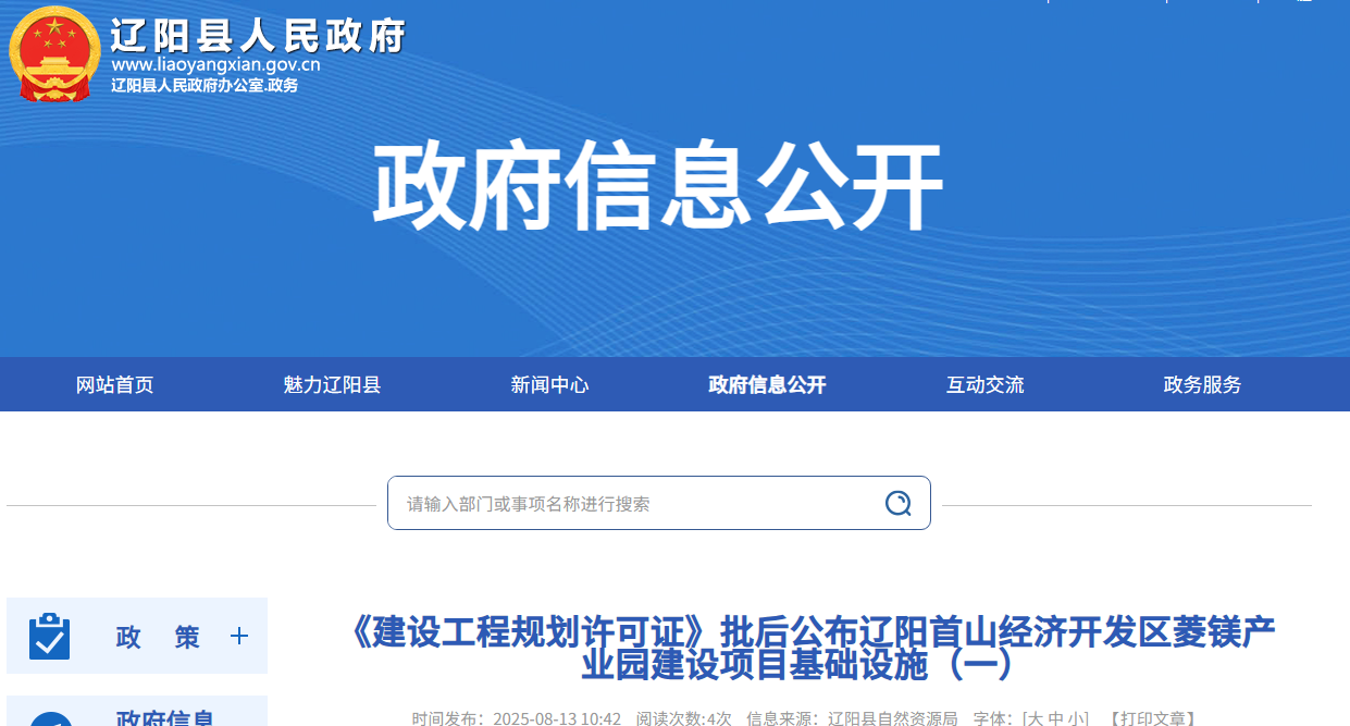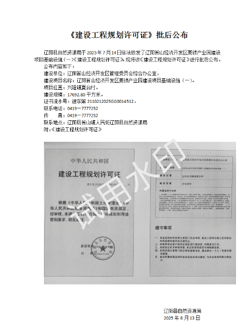 《建设工程规划许可证》批后公布辽阳首山经济开发区菱镁产业园建设项目基础设施(一)