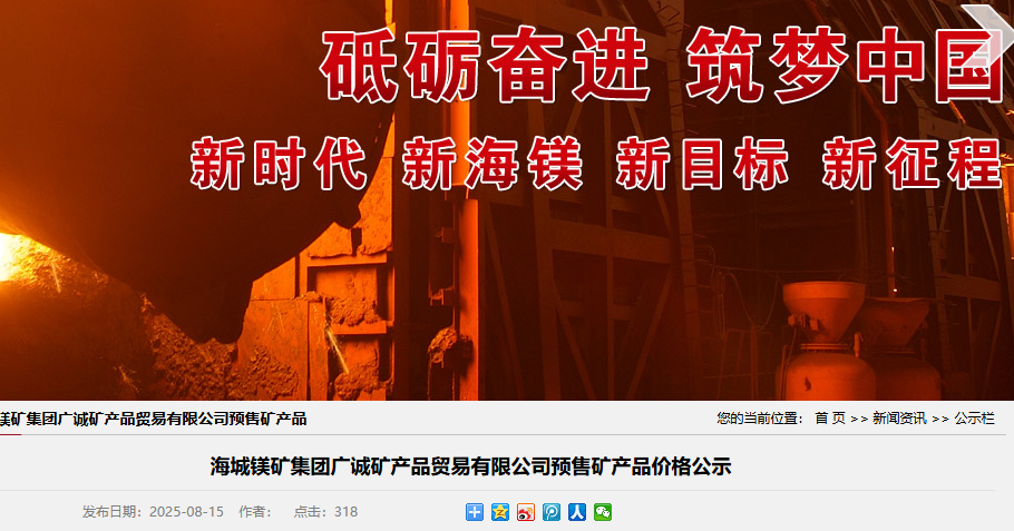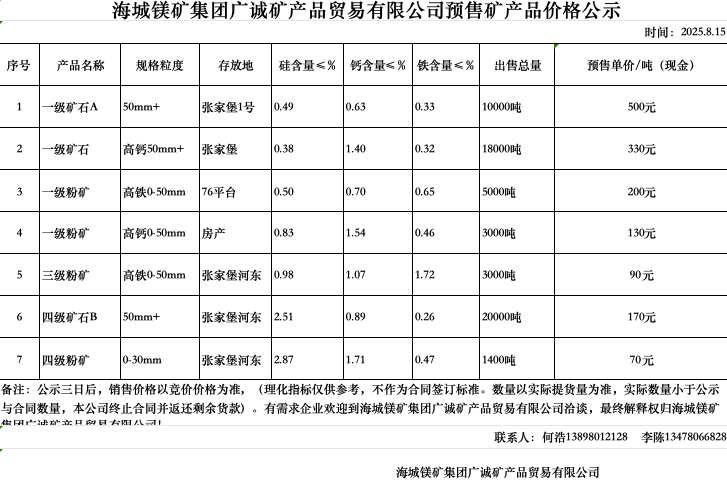 海城镁矿集团广诚矿产品贸易有限公司预售矿产品价格公示