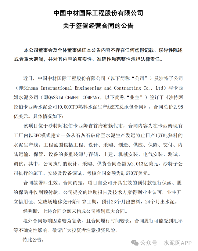 8月15日,中材国际公告称,公司及沙特子公司与卡西姆水泥公司签订了《沙特阿拉伯卡西姆水泥公司10,000TPD熟料水泥生产线EPC总承包合同》,合同总价2.98亿美元(约合21.4亿元人民币)。