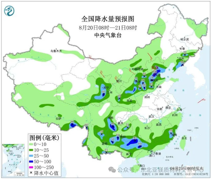 8月20日8时至21日8时,辽宁东部、吉林东南部、青海东部、甘肃南部、陕西北部、山西、北京东南部、天津、河北中南部和东北部、四川盆地西南部、贵州西部和南部、云南北部和东南部、福建中东部、广西北部、广东西北部等地的部分地区有大到暴雨,其中,河北中部等地局地有大暴雨(100~130毫米)。内蒙古中西部、甘肃河西、宁夏、陕西北部、辽东半岛等地的部分地区有4~6级风。