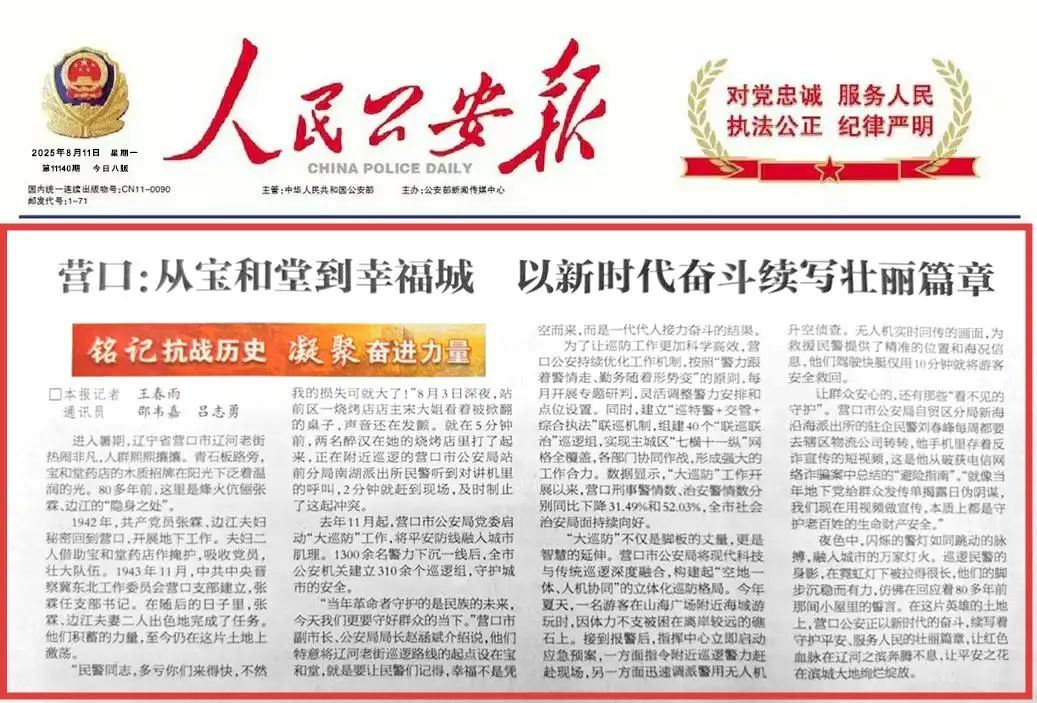 8月11日,《人民公安报》头版【铭记抗战历史 凝聚奋进力量】专栏以“营口:从宝和堂到幸福城 以新时代奋斗续写壮丽篇章”为题,报道了营口市公安局党委部署常态化开展“大巡防”工作、全力守护人民幸福安宁的通讯稿件。
