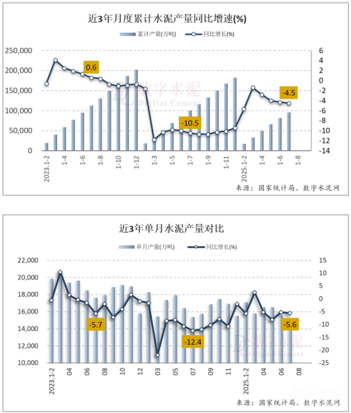 国家统计局数据显示,2025年1-7月,全国累计水泥产量9.58亿吨,同比下降4.5%,降幅较1-6月扩大0.2个百分点,较去年同期收窄6个百分点。7月份,全国单月水泥产量1.46亿吨,环比下降6.4%,同比下降5.6%。单月和累计产量均为2010年以来同期最低水平。