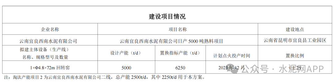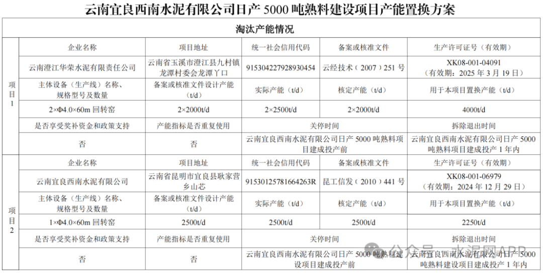 据此前发布的产能置换方案显示,云南宜良西南水泥原计划拟建一条5000t/d水泥熟料生产线,退出产能来自云南澄江华容水泥2*2000t/d,云南宜良西南水泥一条2500t/d(用于此项目2250t/d)。