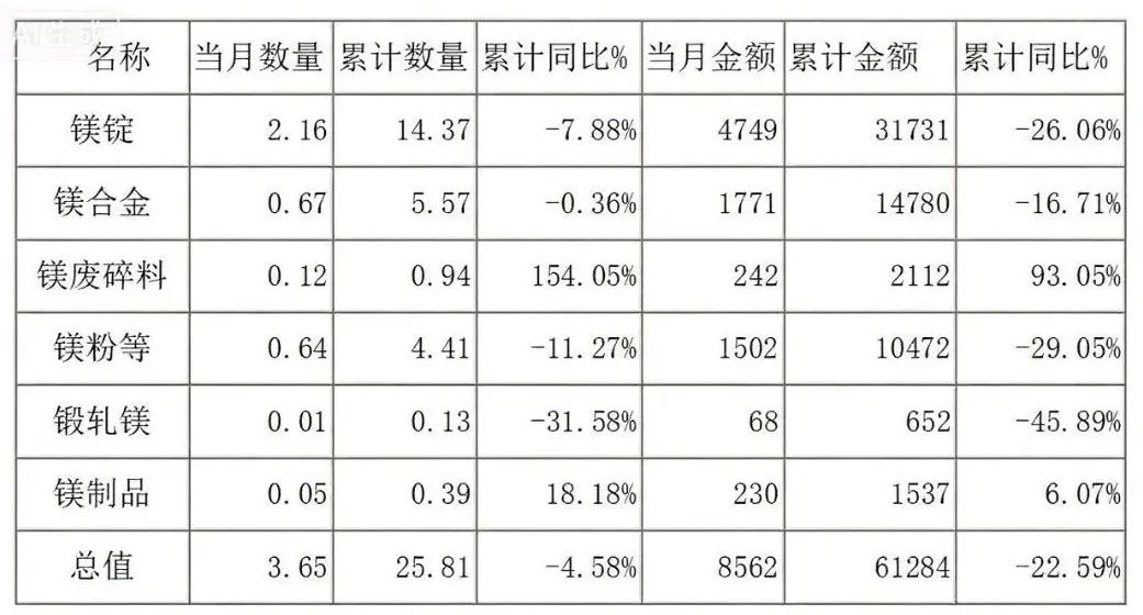 2025年1-7月中国共出口各类镁产品约25.81万吨,同比下降4.58%;其中,镁锭共出口约14.37万吨,同比下降7.88%;镁合金共出口约5.57万吨,同比下降0.36%;镁粉共出口约4.41万吨,同比下降11.27%。