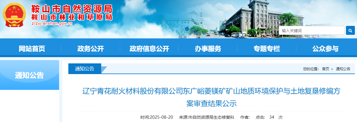 根据《国土资源部办公厅关于做好矿山地质环境保护与土地复垦方案编报有关工作的通知》(国土资规〔2016〕21号)、《辽宁省自然资源厅关于印发<矿山地质环境保护与土地复垦方案省级审查管理办法(试行)>的通知》(辽自然资发〔2022〕129号)有关要求,我局组织专家对《辽宁青花耐火材料股份有限公司东广峪菱镁矿矿山地质环境保护与土地复垦修编方案》进行了审查。现将拟通过的方案及专家评审意见进行公示,公示期自发布之日起7个工作日。